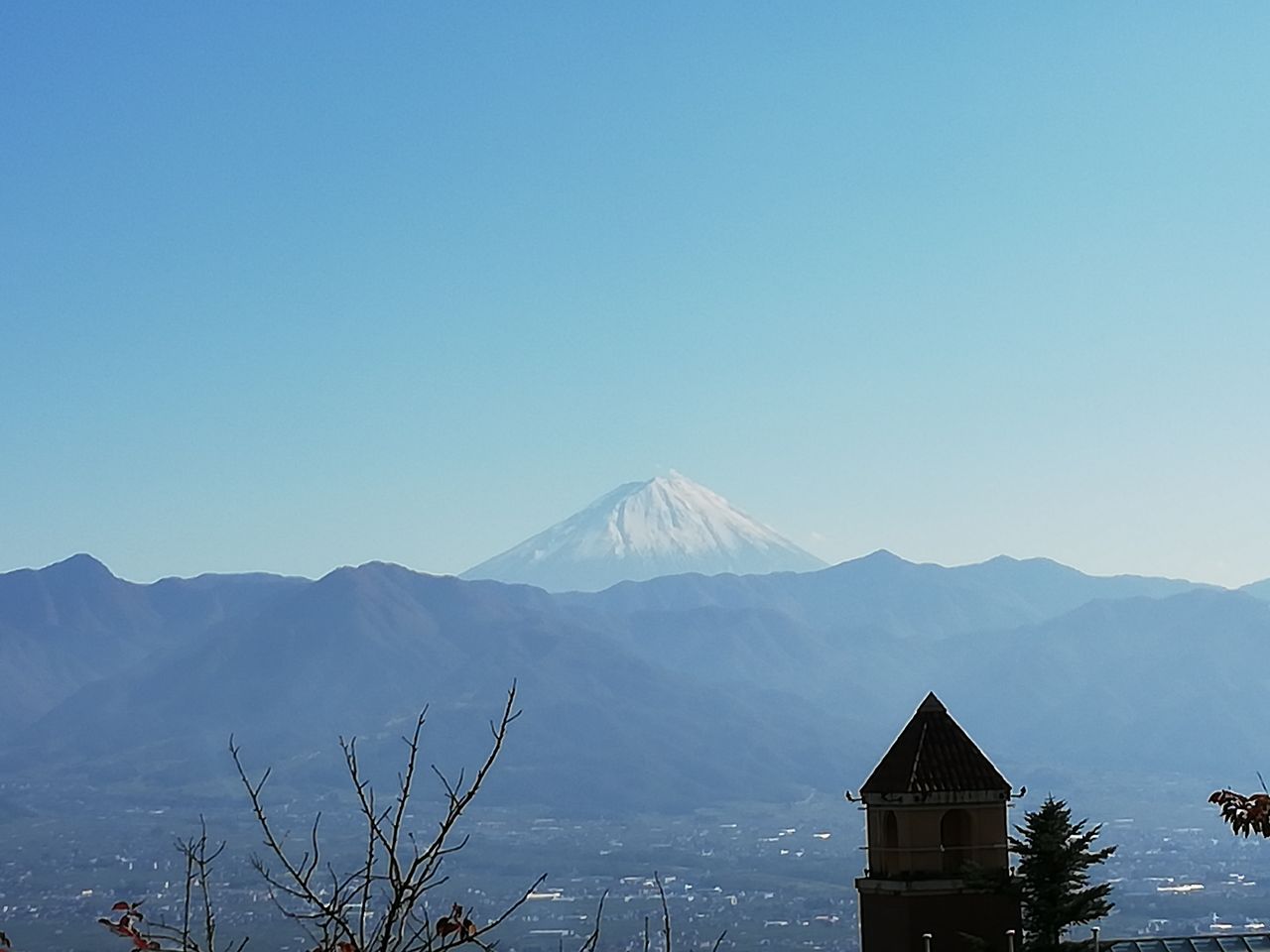 昼間でも、晴れていれば富士山を眺められる。この日は幸運にも、山頂が白く覆われた富士を眺めることができた。