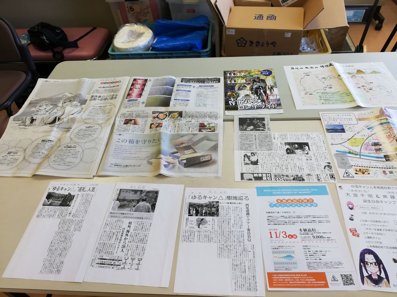 また、一般参加者による即興企画として、「ゆるキャン△」山梨県内での報道資料(新聞切り抜きコピー等)や身延で発行されているチラシ類などの展示も実施された。